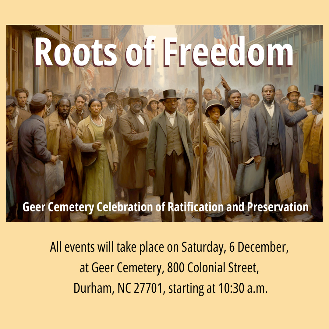 The Friends of Geer Cemetery is hosting a community event on December 6th in celebration of: NC Ratification of 13th Amendment, the preservation of cemetery grounds and headstones completed in 2025, and the unveiling of the National Historic Landmark plaque. The event will be held December 6th, 2025, starting at 10:30 am at Geer Cemetery located at 800 Colonial Street. It is free and open to the public.
